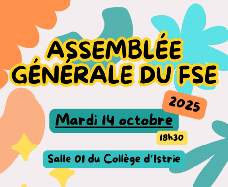 Par LUCIE PELRAT, publié le lundi 6 octobre 2025 22:50 - Mis à jour le lundi 6 octobre 2025 22:51Bonjour, vous êtes invités à l'Assemblée générale du FSE du collège d'Istrie qui aura lieu le mardi 14 octobre à 18h30 en salle 01. Vous trouverez l'invitation avec coupon-réponse dans le carnet de correspondance des élèves (et en PJ de ce message).
